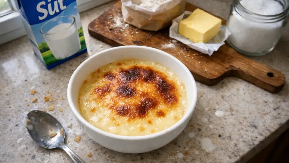Bu tarif; yanık tat vermeden doğru kavrulmuş un, topaksız kıvam ve fırında tam kararında kızarmış bir üst katman hedefler. Malzemeler az, yöntem net: doğru ısı ve sürekli karıştırma ile pürüzsüz, kesilmeyen bir süt helvası elde edersiniz.